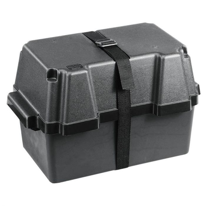 Accubak gemaakt van kunststof met riem en deksel..