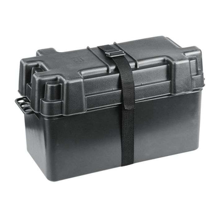 Accubak gemaakt van zuurbestendig kunststof met riem en deksel..