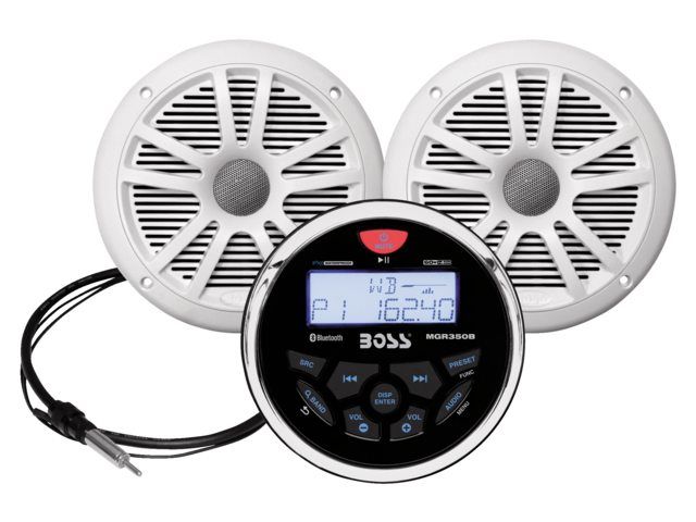 Een complete audioset voor aan boord, bestaat uit een ontvanger met radio antenne en een speakerset.