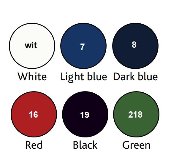 Kleuren wit, l.blauw, d.blauw, rood en groen