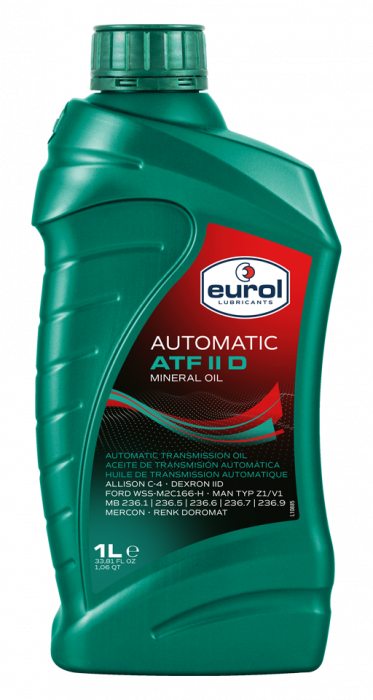 Eurol ATF II D is een automatische transmissie olie voor de meeste personenwagens, (hef)trucks en bussen van Europese, Amerikaanse of Japanse makelij. Bovendien is het geschikt voor bepaalde stuurbekrachtigingen, koppelomvormers, wisselbakken, vloeistofkoppelingen en eenvoudige hydraulische overbrengingen.