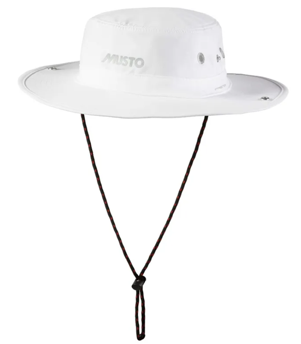 Musto zonnehoed wit sneldrogend Deze Evolution Fast Dry Brimmed Hat is gemaakt van snel drogende stof en biedt een goede bescherming voor lange periodes en bij blootstelling aan zonlicht. Een UV van 40 en de brede rand bieden verbeterde bescherming tegen de zon, terwijl een drukknoopsluiting de rand aan de hoed vastzet wanneer dat niet nodig is.