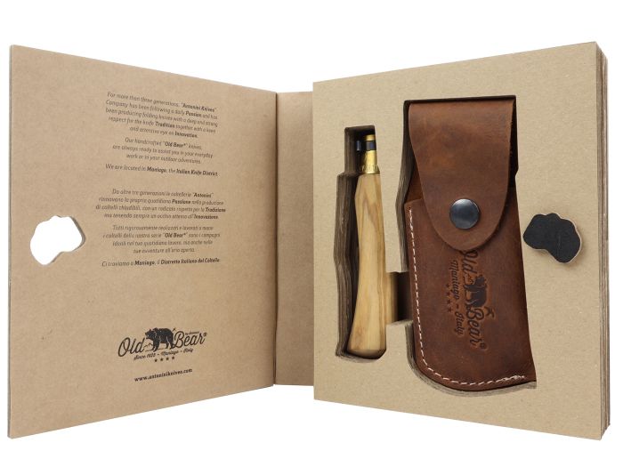 De messing Ring-Lock vergrendeling houdt het mes stevig vast — zowel in geopende als gesloten stand — voor maximale veiligheid. De Old Bear Classical Olijfhout M wordt geleverd met een leren etui in een milieuvriendelijke geschenkdoos, ideaal voor verzamelaars en liefhebbers van ambachtelijk vakmanschap.