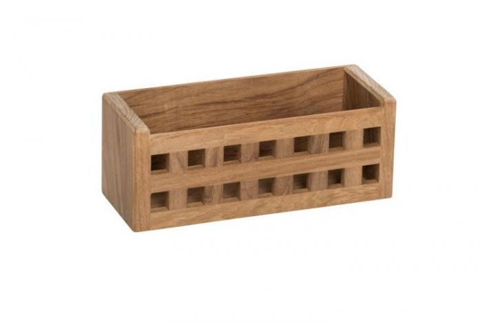 Teakhouten opbergrekje, model 'blokrooster'.Dit handige rekje is door de open vorm uitermate geschikt als houder voor een fles douchegel en shampoo in de natte cel. Maar uiteraard kan hij ook worden gebruikt als bewaarplek voor uw mobiele telefoon.