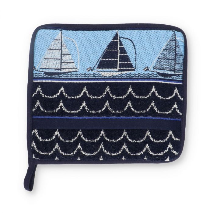 Deze pannenlap van Bunzlau Castle houd warmte goed tegen en beschermt je handen bij het oppakken van hete pannen of schalen. De donkerblauwe pannenlap heeft een nautische zeilboot print met golven. De pannenlap heeft een handige ophanglus voor in de kombuis of in de keuken.