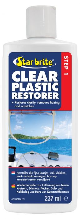 Clear Plastic Restorer – Step 1 Star brite Clear Plastic Restorer is een krachtige eerste stap in het herstellen van aangetast of verweerd kunststof. Het verwijdert fijne krasjes, vlekken, vuil, zout- en kalkaanslag en brengt doorzichtige kunststof oppervlakken weer terug naar hun oorspronkelijke helderheid. Ideaal voor kunststof ramen, polycarbonaat en andere transparante kunststoffen aan boord, in de auto of in huis.