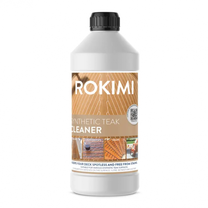 Rokimi Synthetic Teak Cleaner wordt gebruikt voor het reinigen van alle soorten synthetische teakvloeren of -dekken, ongeacht de kleur. Rokimi Synthetic Teak Cleaner tast geen kitnaden of kunststof aan en verwijdert grondig alle vuil en ongerechtigheden van oneffen oppervlakken, inclusief groene aanslag. Schoonmaken is heel eenvoudig met de Rokimi borstel. In handzame flessen van 1 liter.