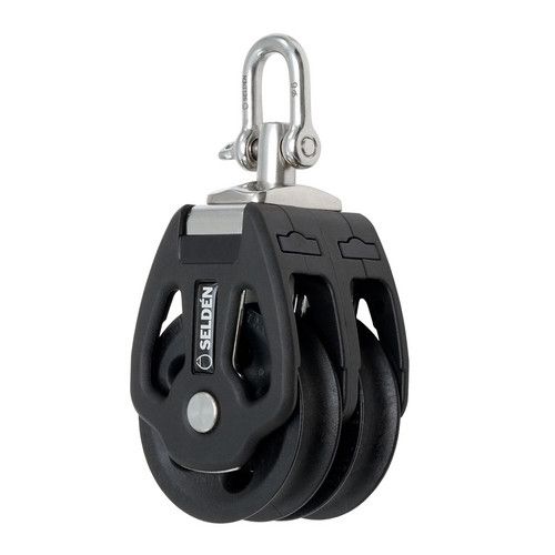 Selden tweeschijfsblok60mm tweeschijfs blok Gemaakt van hoogwaardige kunststof en RVSmaximale lijndikte 14 mm,SWL 1000 Kg (2000)Door middel van schuifsysteem fixeerbare wartel en D-sluiting.