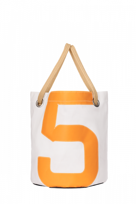 Oranje strandtas van gerecycled zeildoek met slimme geperforeerde bodem tegen zand. Groot, duurzaam en ideaal voor zomerse dagen met het hele gezin.