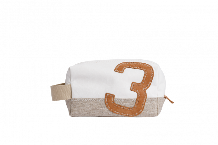 Windy toilettas van 727 Sailbags in linnen en bruin leer. Gemaakt van gerecycled zeil. Praktisch, stijlvol en ideaal voor onderweg.