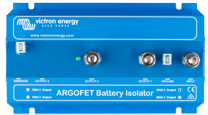 Victron Argofet 200-2 FET laadstroomverdeler voor het gelijktijdig laden van twee accubanken met één dynamo of acculader. Zeer laag spanningsverlies en voorzien van energize-aansluiting.